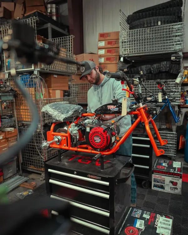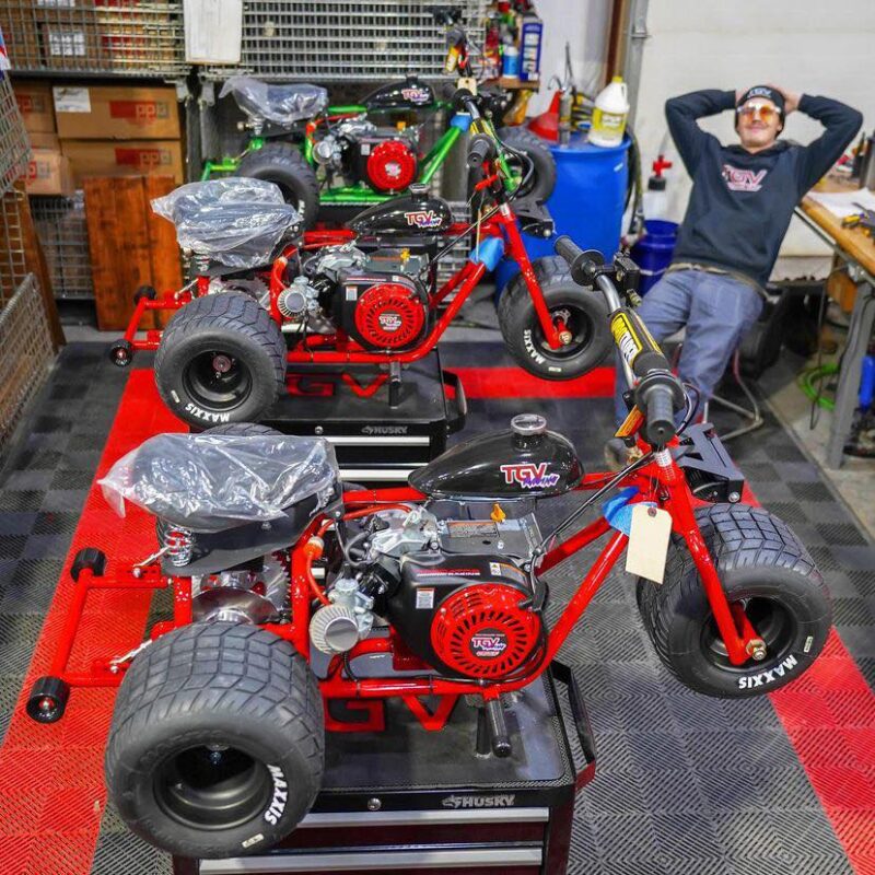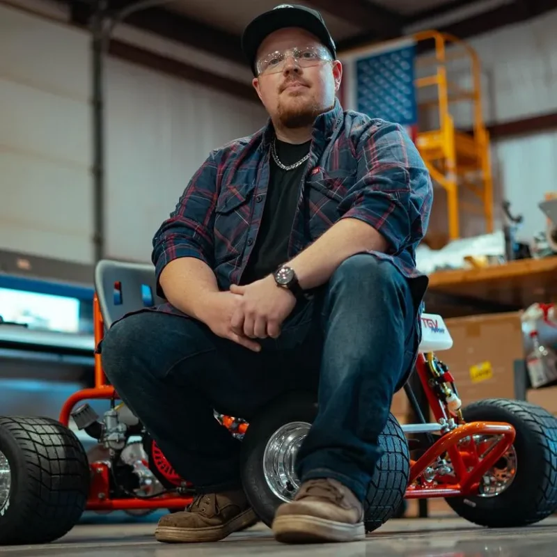 Stretch is our lead welder and assembler of mini trikes! He enjoys wrenching on his OBS Ford F350 Dually and drinking Lattes. He’s also the tallest guy in the shop, hence why we call him “Stretch”